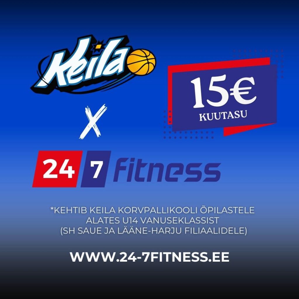 24-7 Fitness pakub Keila Korvpallikooli õpilastele lisavõimalusi füüsilise vormi arendamiseks -30% soodsamalt!Kõigile Keila Korvpallikooli õpilastele (sh Saue ja Lääne-Harju filiaalide õpilastele) kehtib alates U14 vanuseklassist soodushind vaid 15€ kuus kõikides 24-7 Fitness spordiklubides!